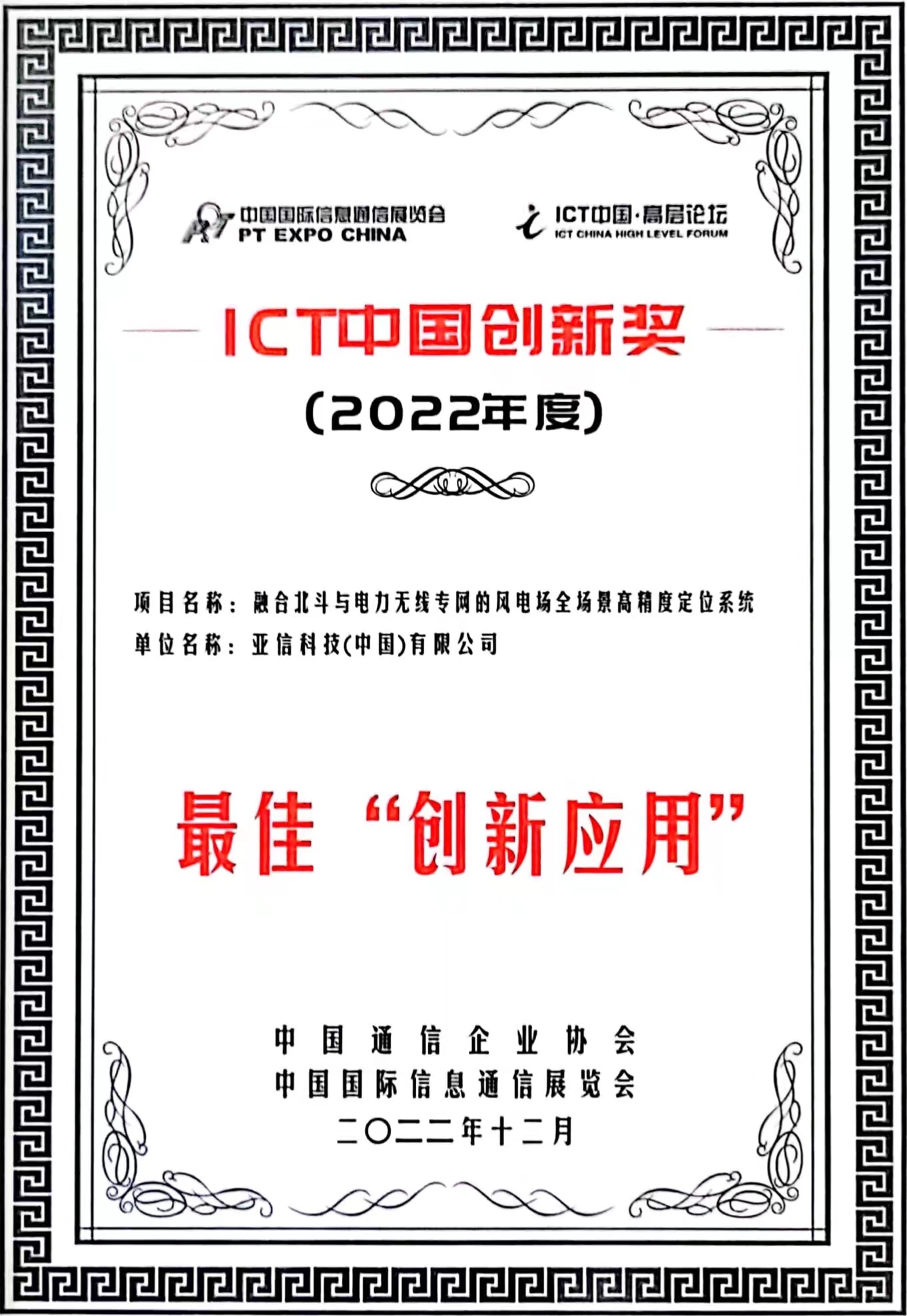 2022年12月 304am永利集团“融合北斗与电力无线专网的风电场全场景高精度定位系统”荣获“ICT中国创新奖”