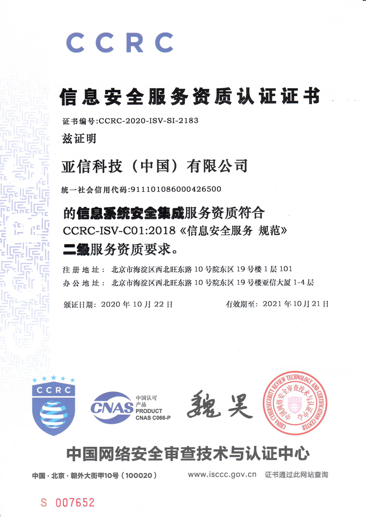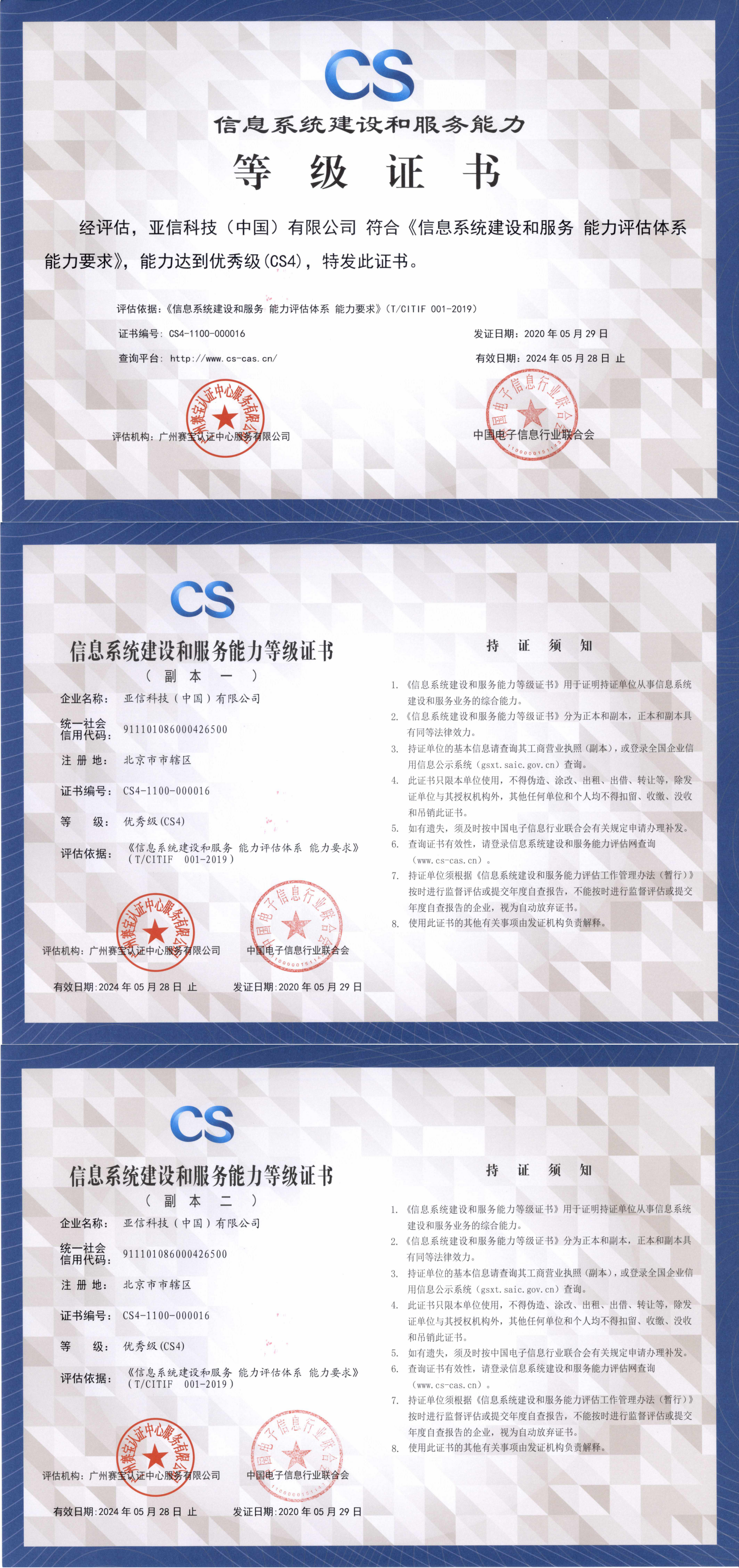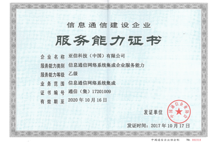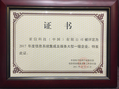 2017年12月亚信软件荣获《2017年度信息系统集成及服务大型一级企业》证书