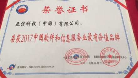2017年9月亚信荣获“2017中国软件和信息服务业最有价值品牌”
