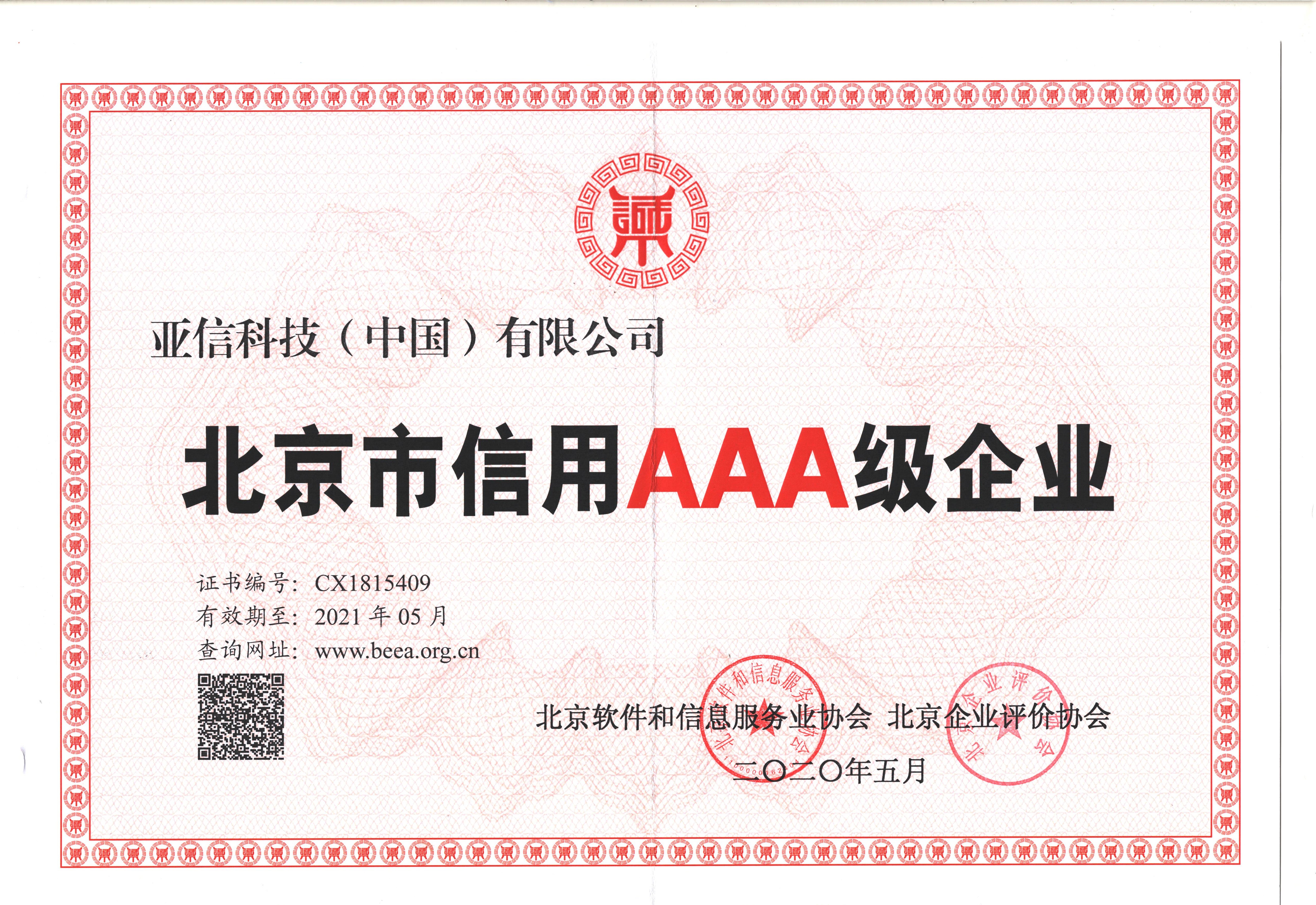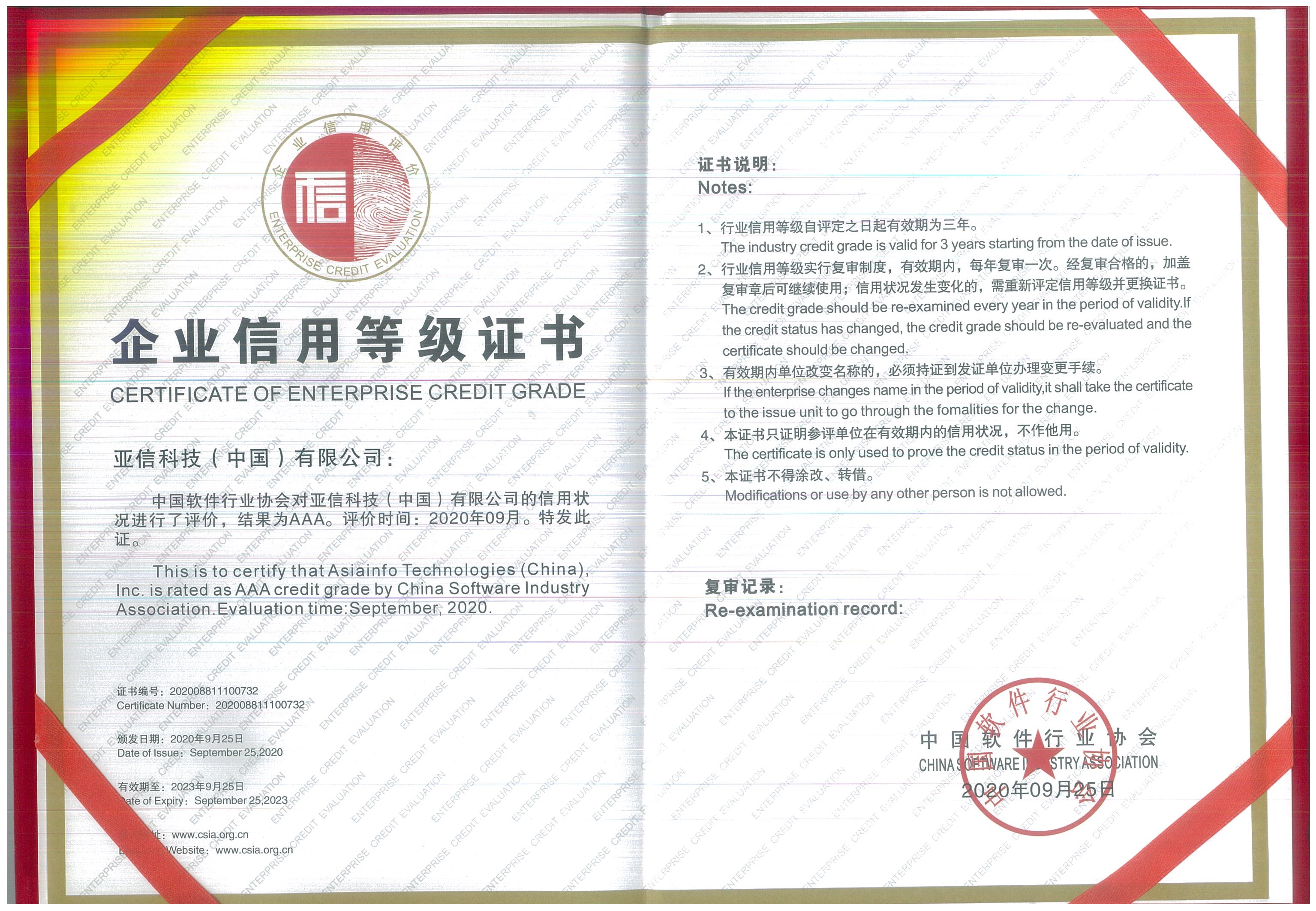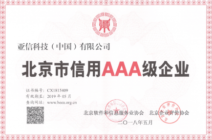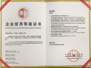 2017年7月亚信获得中国软件和信息服务企业AAA信用评级