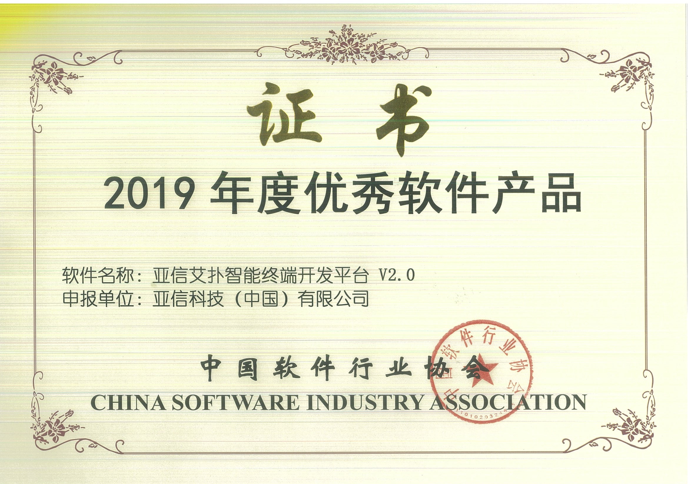 2019年12月 亚信艾扑智能终端开放平台V2.0荣获“2019年度优秀软件产品”
