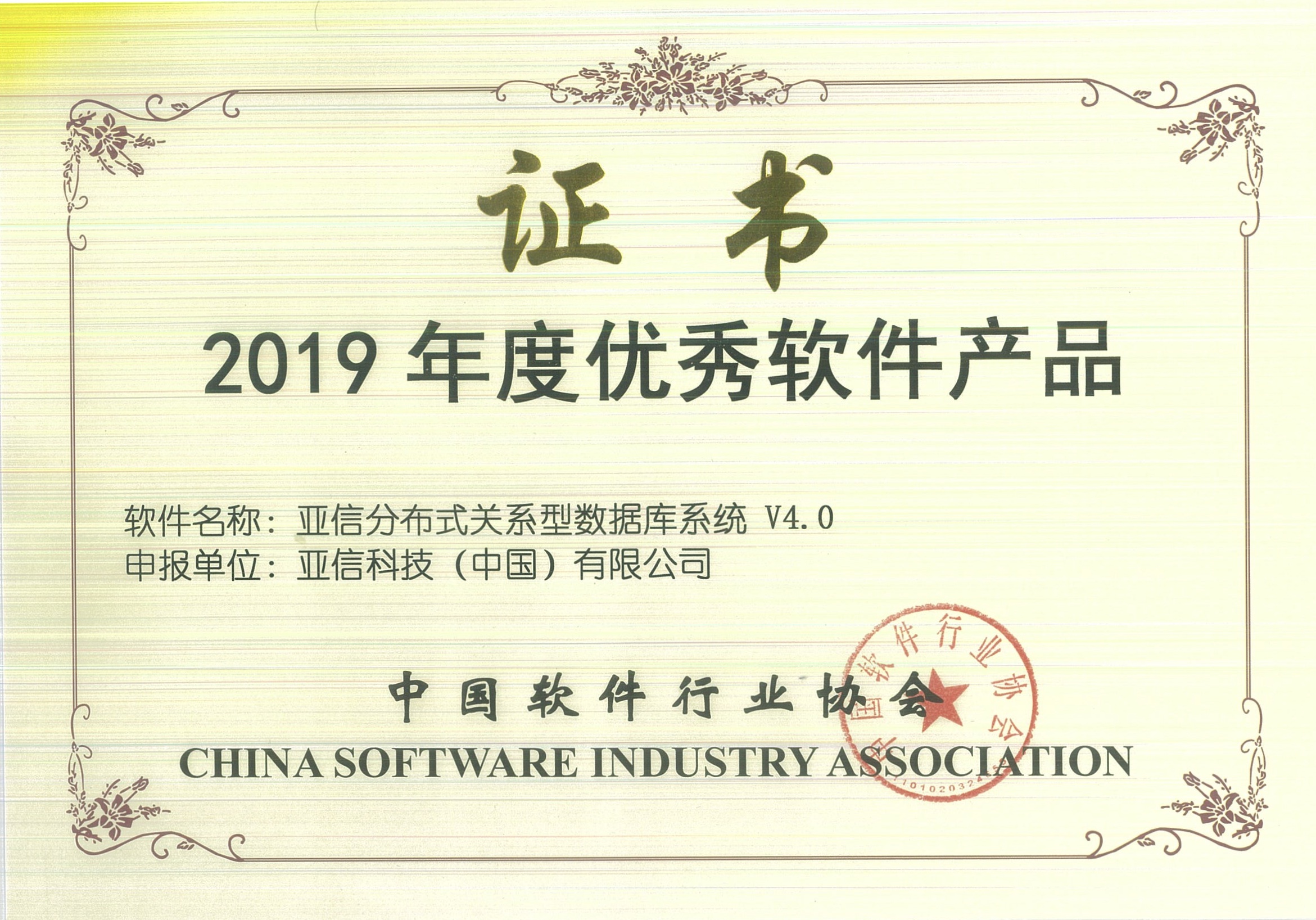 2019年12月 亚信分布式关系型数据库系统V4.0荣获“2019年度优秀软件产品”