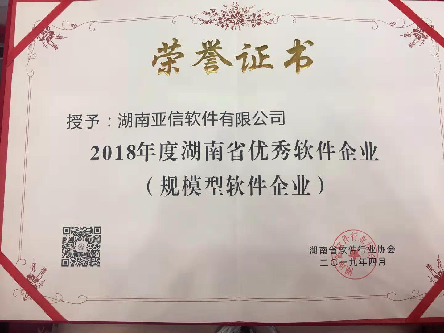 2019年4月 湖南亚信软件有限公司荣获“2018年度湖南省优秀软件企业(规模型软件企业)”