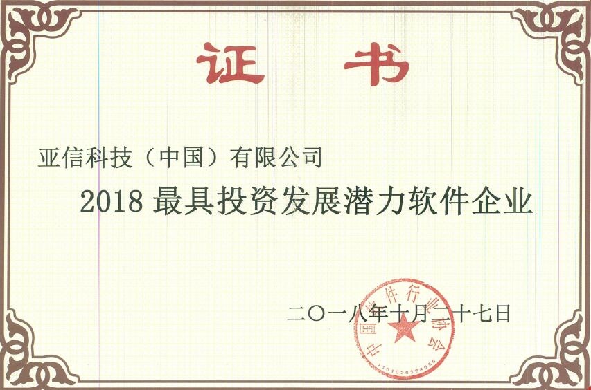 2018年10月 304am永利集团荣获“最具投资发展潜力软件企业”