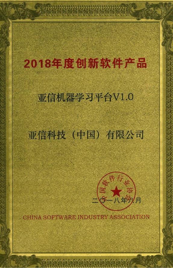 2018年6月亚信机器学习平台荣获“2017-2018年度中国软件和信息服务业最具竞争力产品奖”